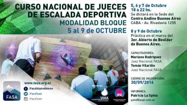 Del 5 al 7 de octubre se dictará el Curso Nacional de Jueces de Escalada Deportiva FASA con la dirección de Mariano Rodriguez y Tomás Vilariño.